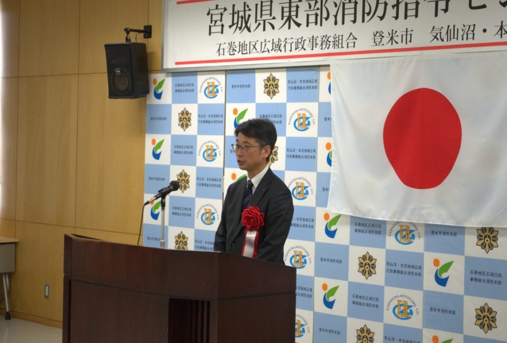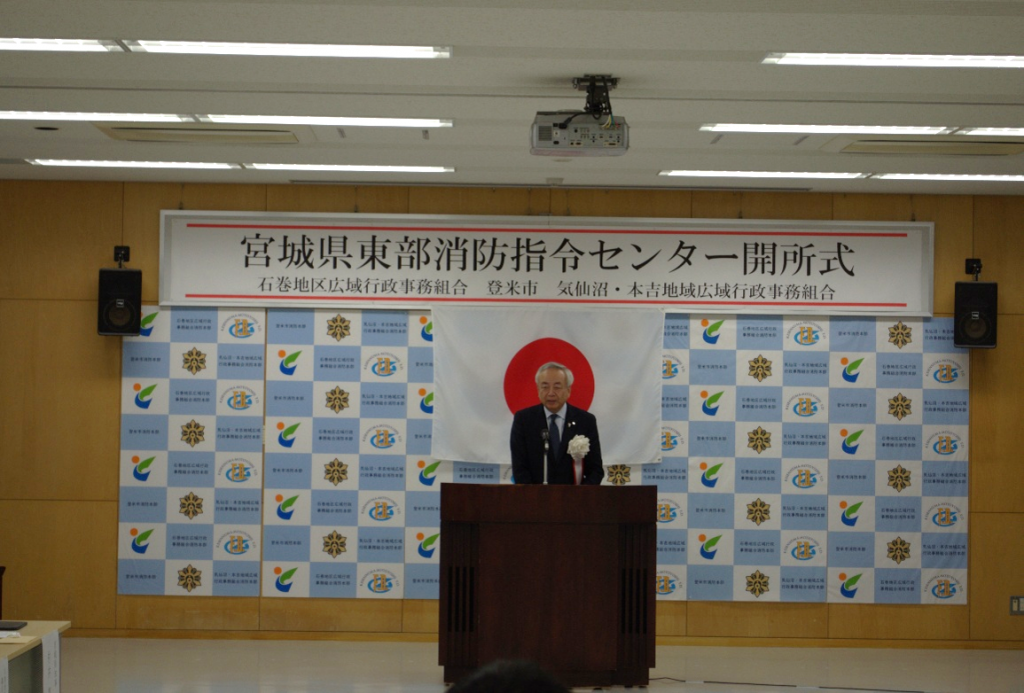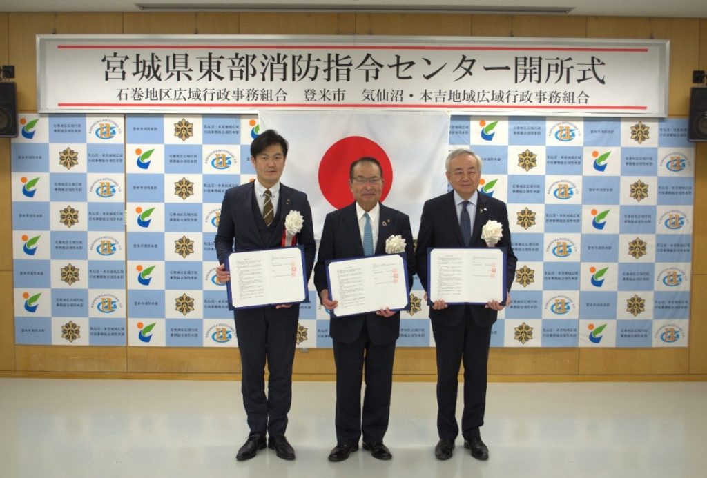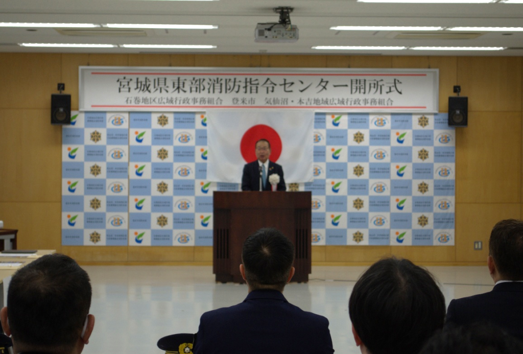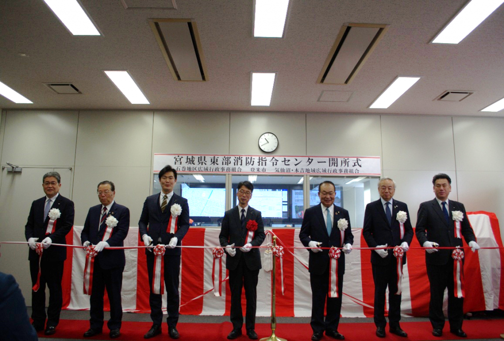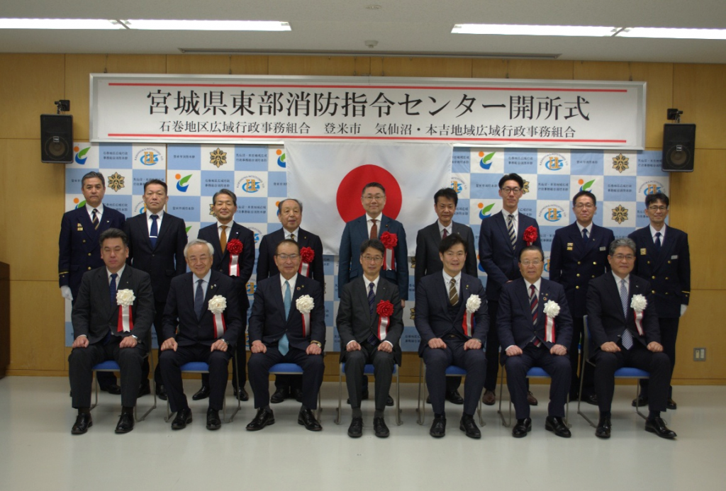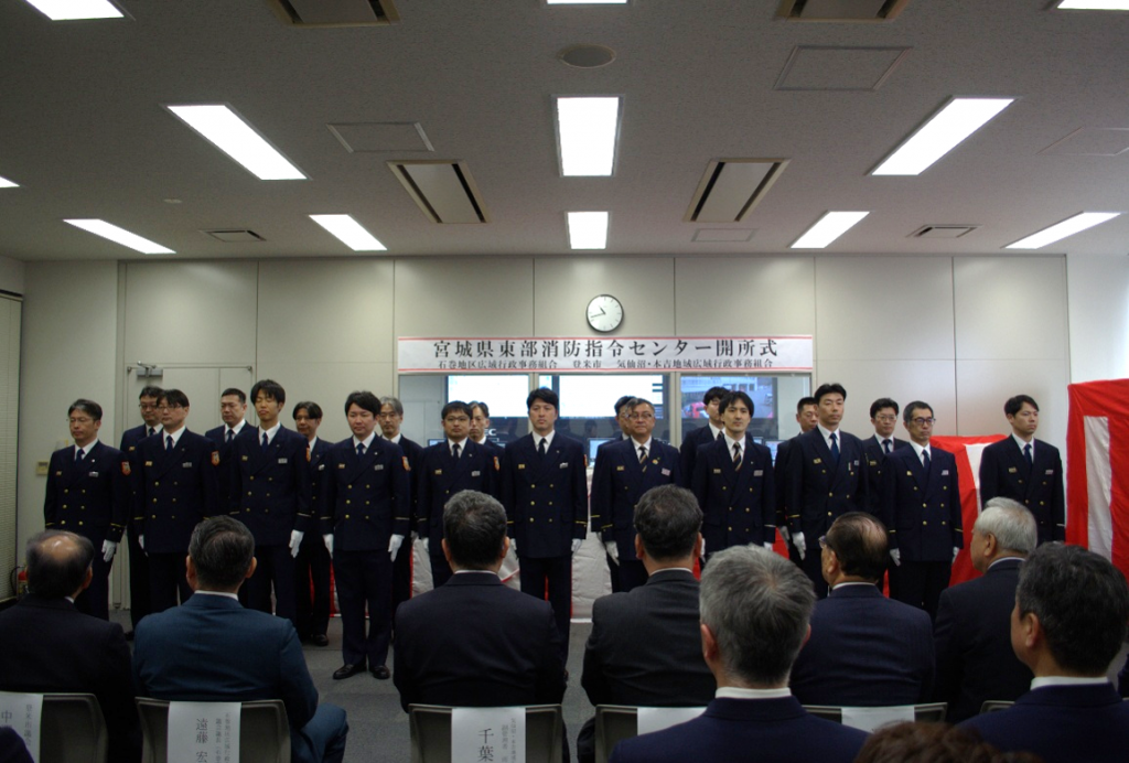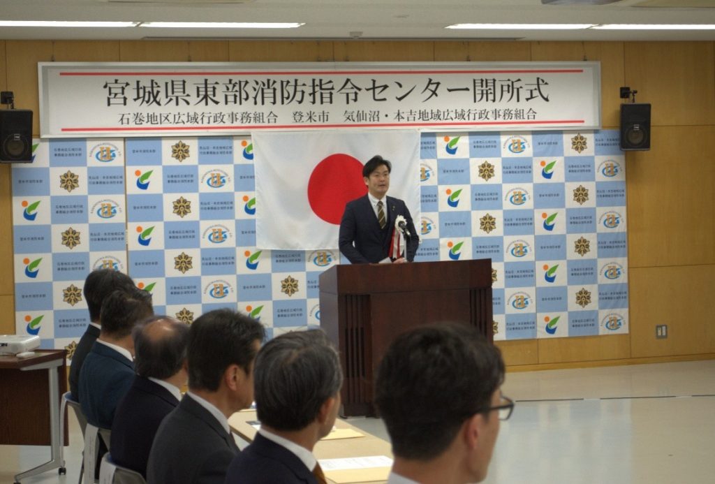 令和8年4月1日から「石巻地区」、「登米市」、「気仙沼・本吉地域」の3消防本部が共同で119番通報の受付や消防署・救急車の出動指令を行う宮城県東部消防指令センターの運用を開始し、開所式が4月4日、石巻地区消防本部で行われました。