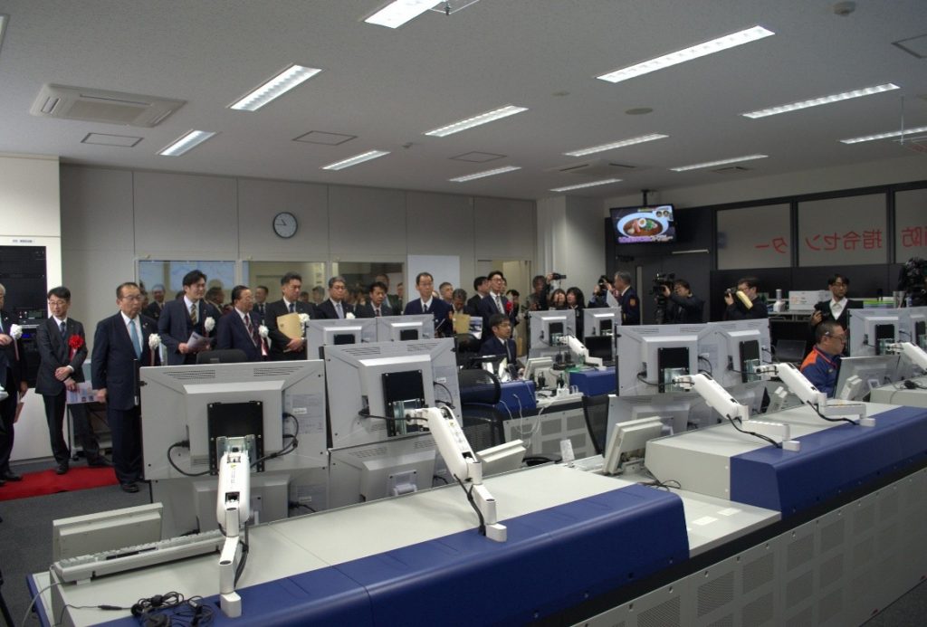 開所式には管轄する4市2町の首長や関係者約30名が出席し、協定書の披露やテープカットが行われました。その後、各消防本部から派遣され指令業務にあたる職員の紹介と、火災の119番通報から出動指令、消防隊の出動までの流れや、119番通報者が撮影した映像を指令センターで受信し、指令員が確認できる映像通報システムについてデモンストレーションを行い、出席者に披露されました。