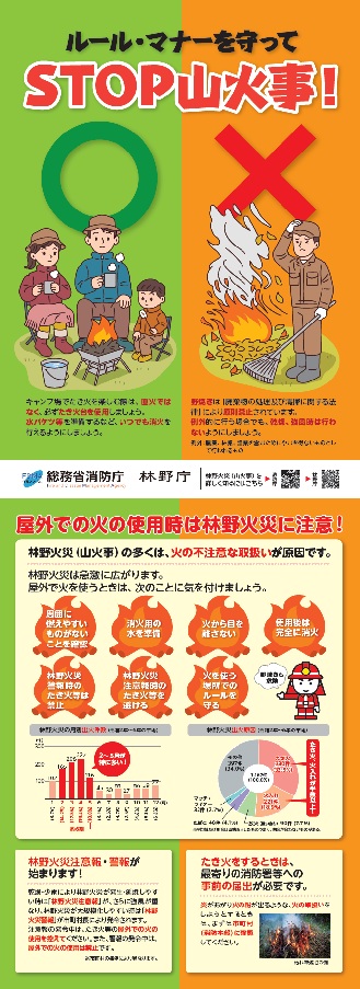 このことから、大切な郷土を守るため、住民の皆様にはいつでも消火できるよう準備をしていただくなど、屋外での火の取り扱いには十分な注意をお願いします。
