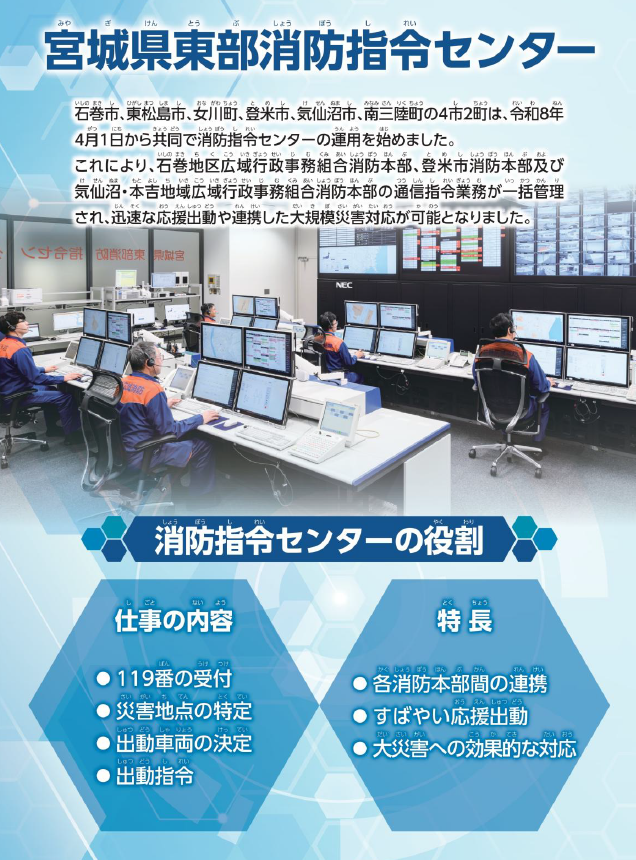ここでは、宮城県東部消防指令センターの概要を紹介します。