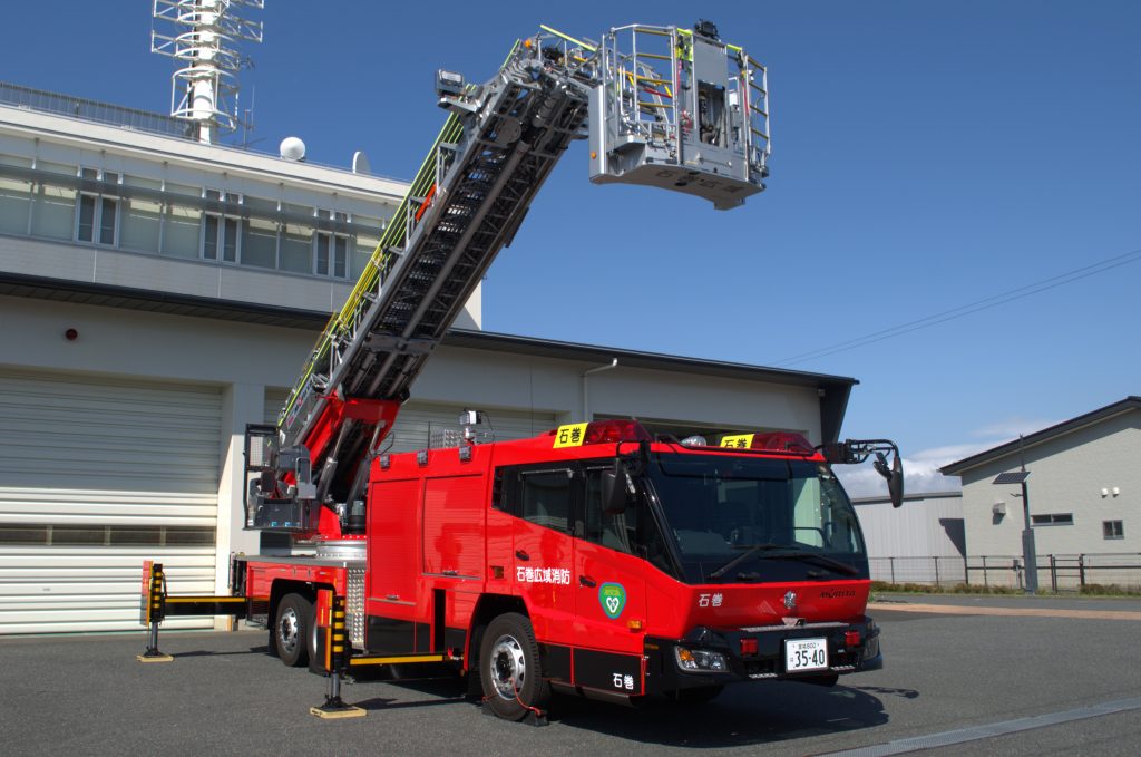 はしご部分が最大35メートルの高さまで伸び、高所からの放水や逃げおくれた人の救出に使われます。また、はしごの先端が曲がるため建物の屋上に設けられているフェンス等を乗り越えての救助ができます。